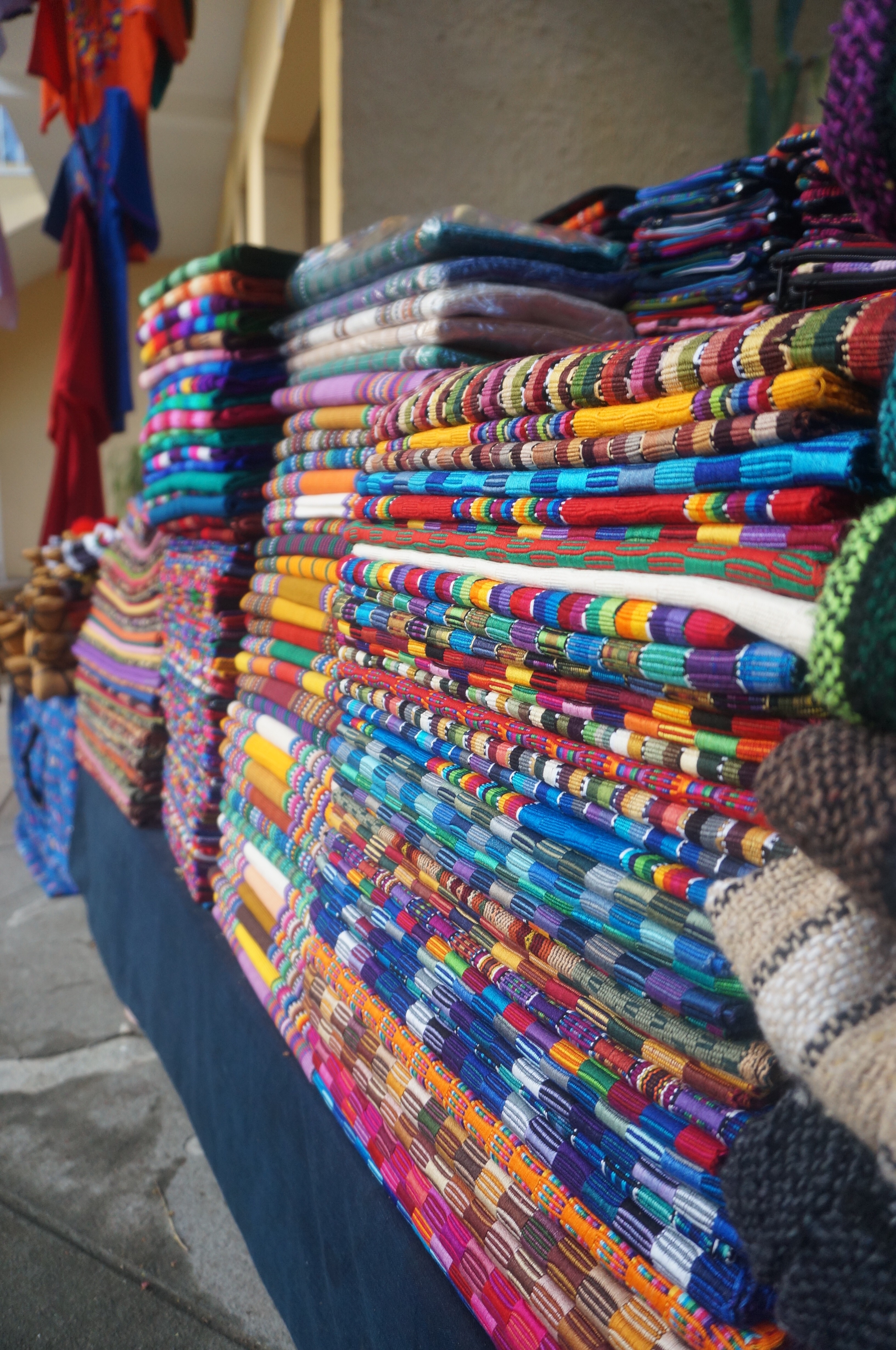 Against the backdrop of tree-leafed palm trees and a cool brown wall, vibrant warm colors explode. Orange, yellow, blue and pink are meshed together to create beautiful Guatemalan patters. Debbie, a native to Guatemala, displays her designs in a pop-up shop at a Zacapa hotel.